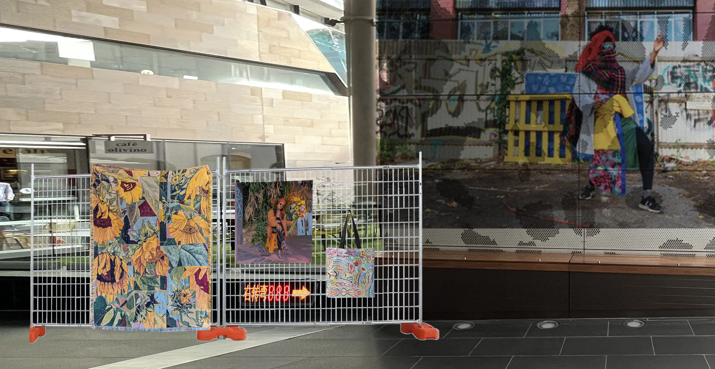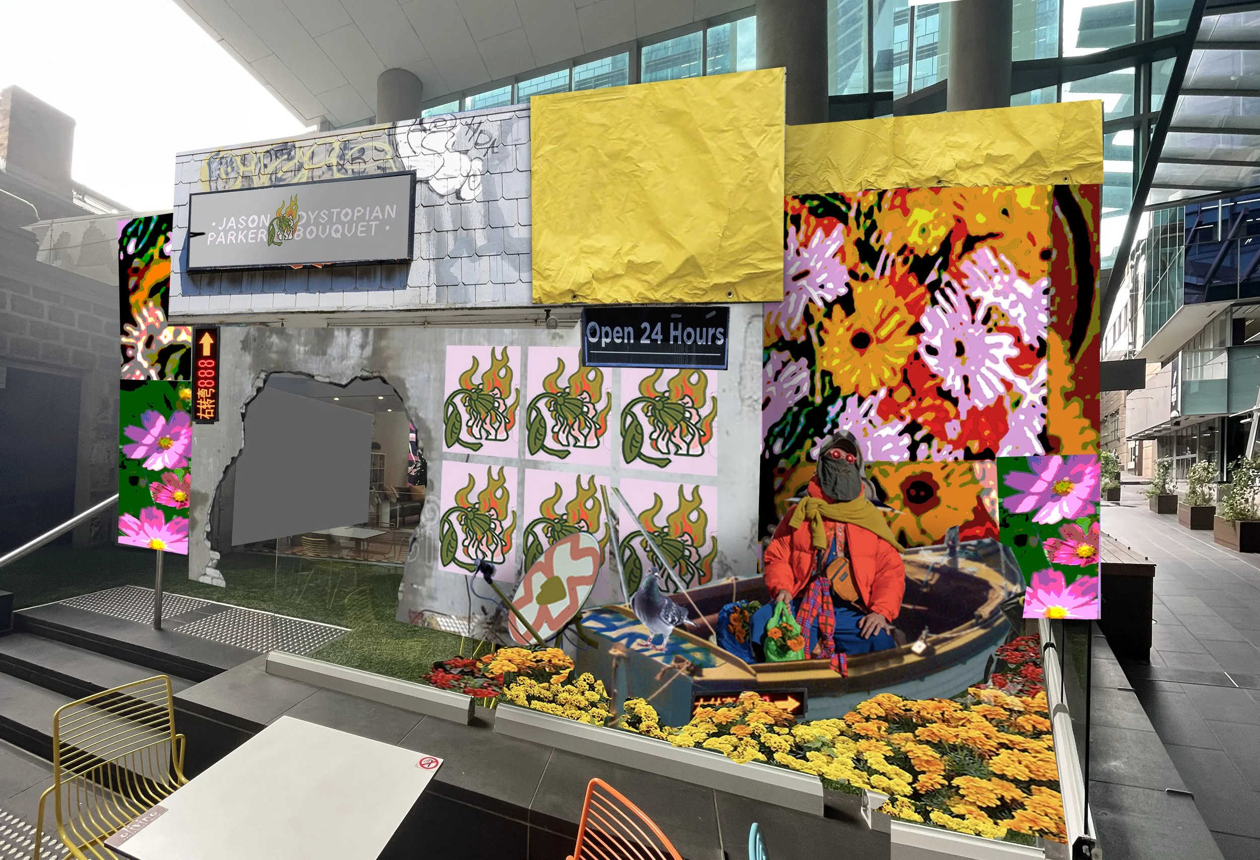 I would like to install an entranceway/building that allows you to enter the exhibition through a hole in the wall into my dystopian wonderland. This will all be constructed to be free-standing out of wood and polystyrene painted to look like concrete and will incur no damage to the facade of your building. On either side of this entranceway, I will drape the building in a floral-painted patchwork canvas that is stitched together and hung from the top. Again, everything will be hung in a manner that no damage is done to your building. To finish off my eye-catching entranceway within the small space in front of the building, I will install a sculpture/art installation of a character in a boat rowing through a field of (fake) flowers.